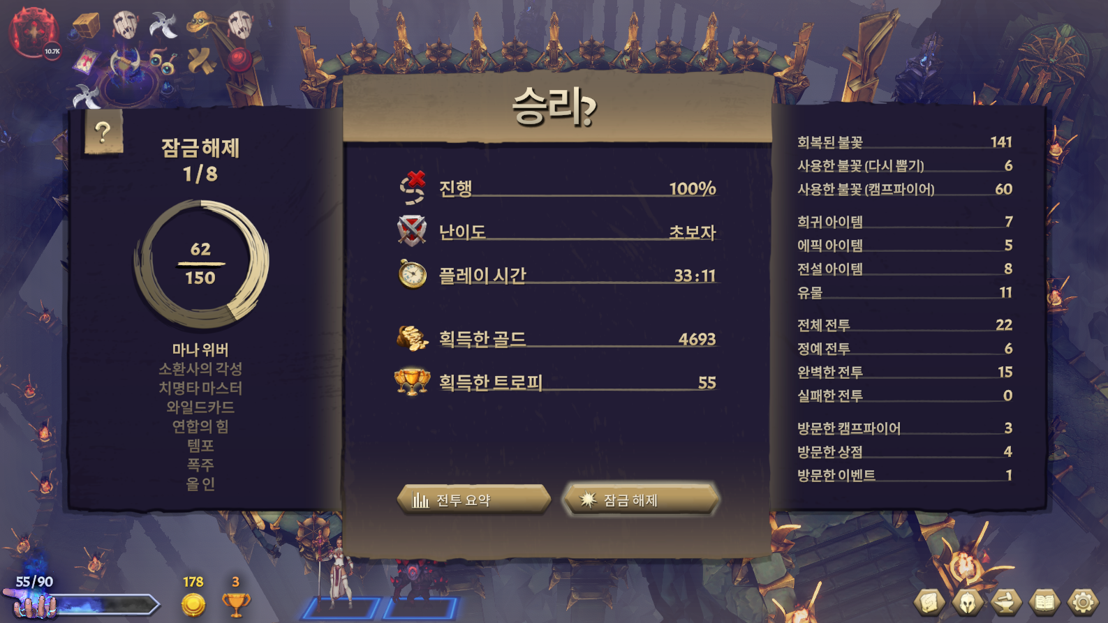각 전투가 끝날 때마다 보상과 장비, 기물을 획득할 수 있으며