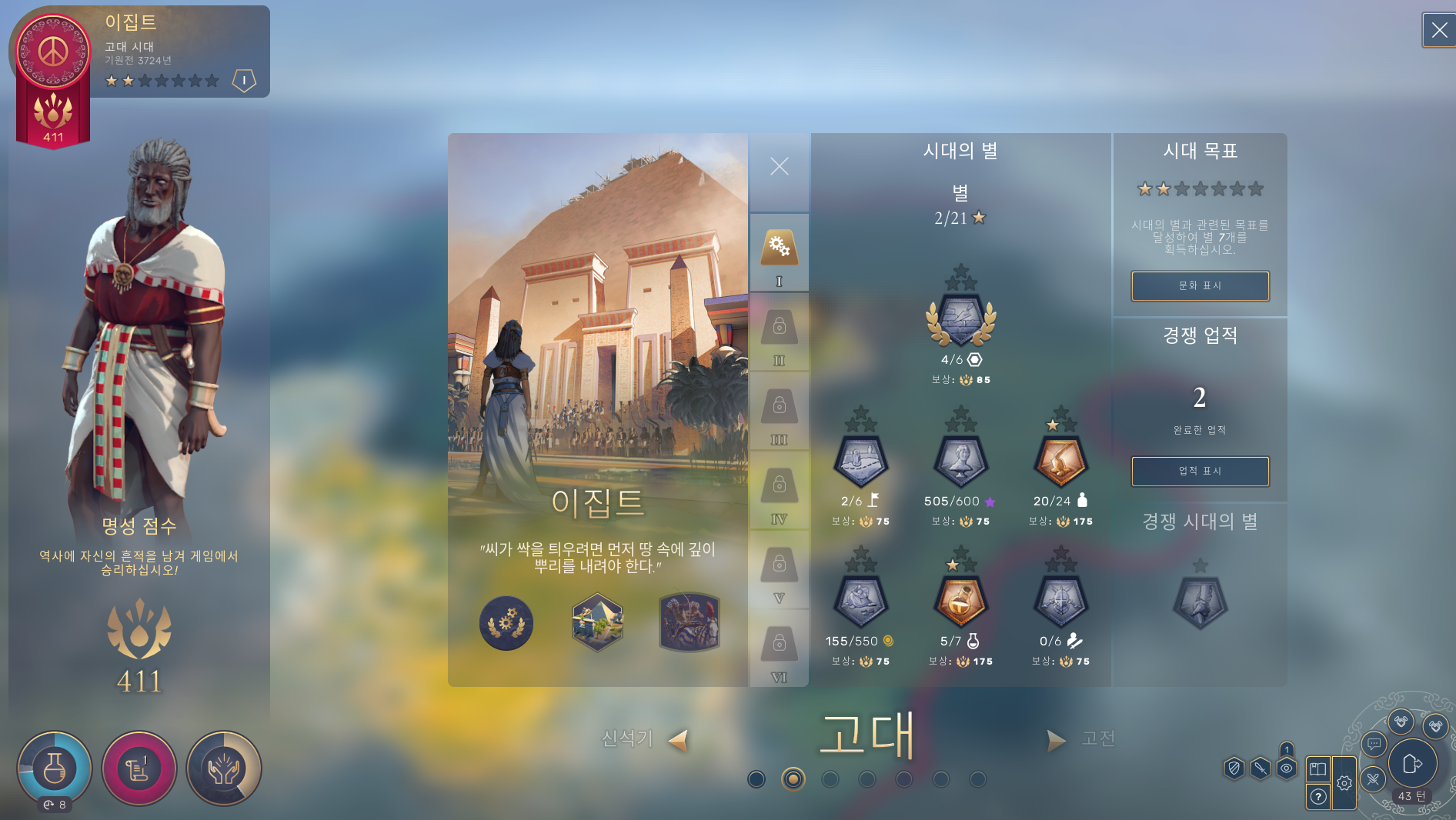 이러한 시스템은 문명과 비슷해보이지만 한가지 문명으로 엔딩까지 계속 플레이하는게 아닌
